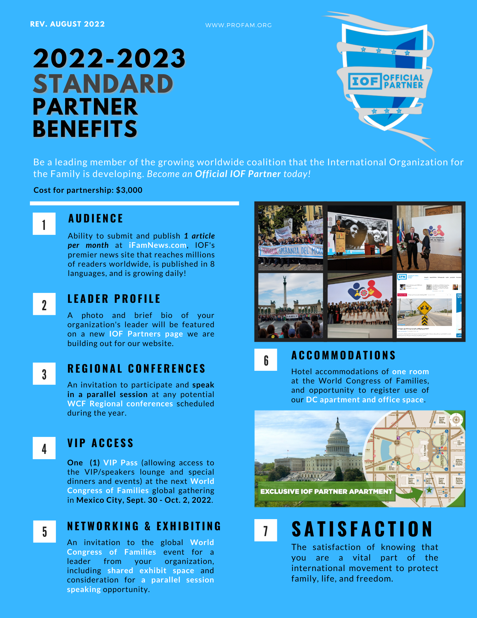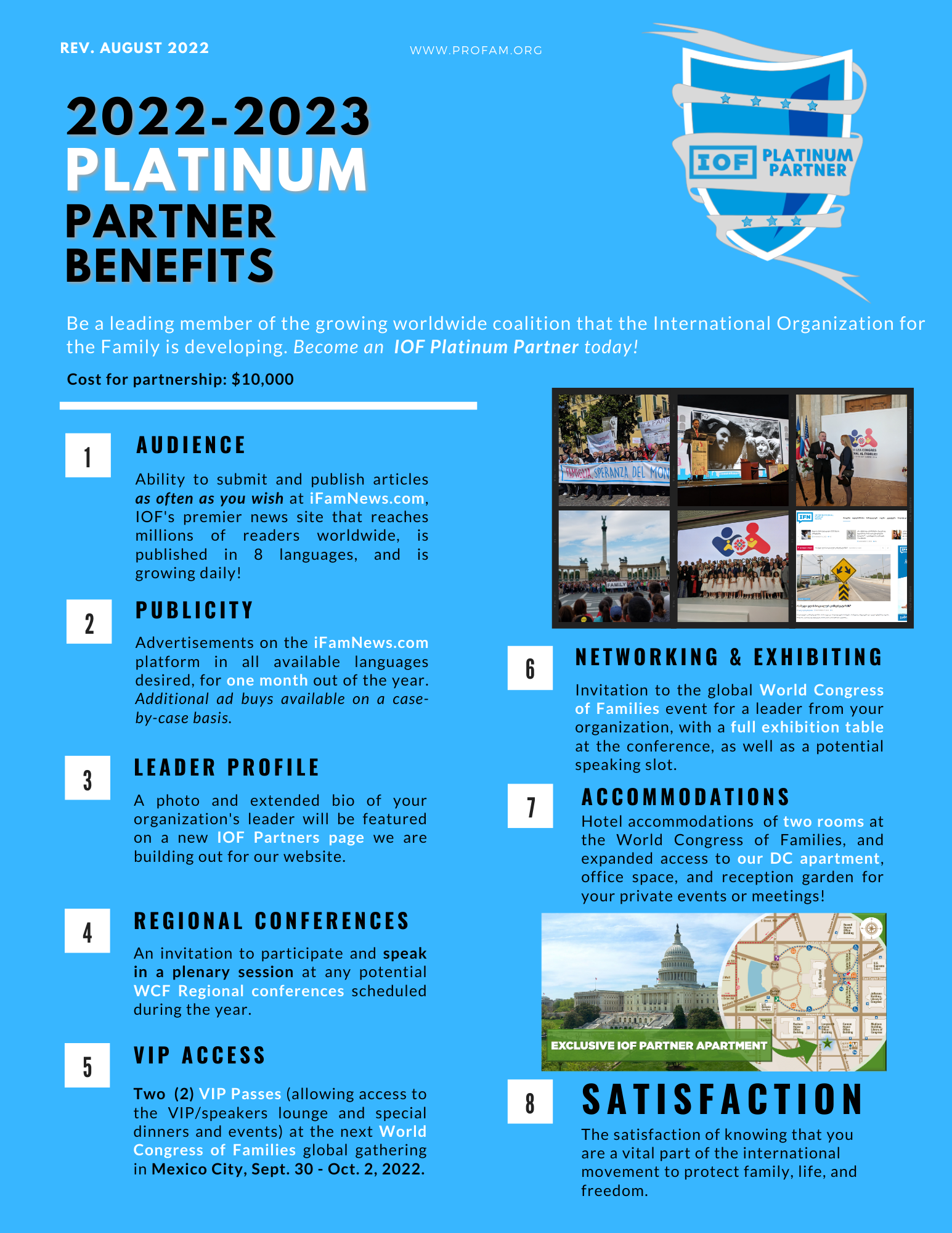 • Receive (1) VIP admission to our World Congress of Families (in-person or digital), along with a hotel accommodation (if applicable);